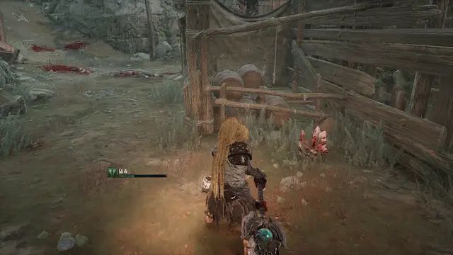- 中央倉庫への進入路 – 村の中央倉庫へ向かう途中エリア。エリートモンスター(大型敵)が待ち伏せしていた広場の近く、建物の壁際に赤い鬼石が落ちている。戦闘後に周辺を探索して回収。