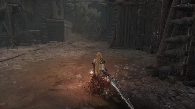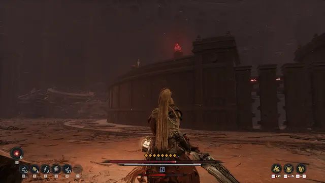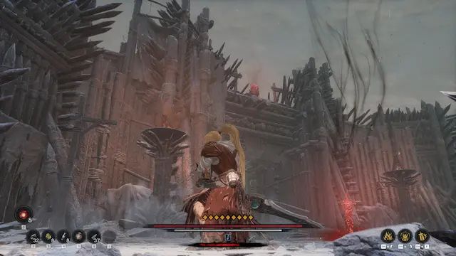 8. 沈黙の広場 – ボス手前の広場(鬼剣「沈黙の広場」)エリア。奥の門の上部に鬼石がある。地上からは届かない高さのため、橋の下から投槍で破壊して入手する。