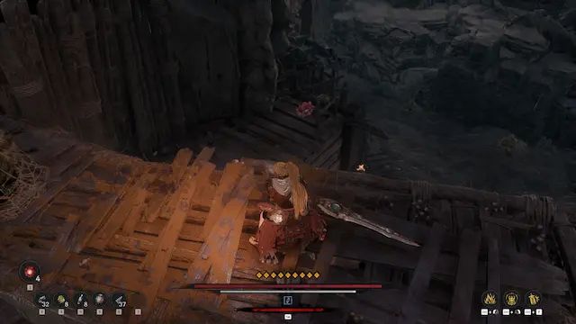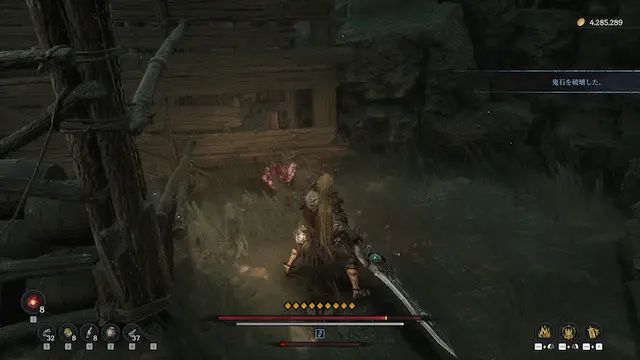 - 採石場の臨時拠点 – 廃坑マップ入口。道を塞いでいた大型の毒グモを倒し、朽ちた足場を降りた先の行き止まりに鬼石。足場下の隅に赤く光る結晶が落ちている。