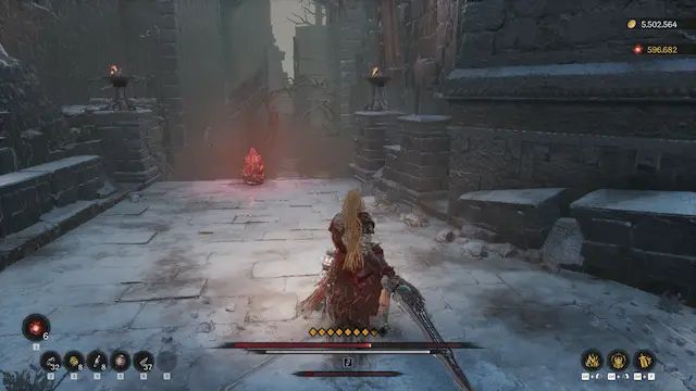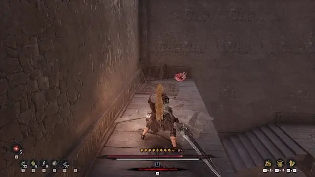 ・禁じられた通路 – 大神殿地下の禁断エリア。強敵「怨恨抱く名高き戦士」がいる部屋の次の通路で、右手の隠し壁を壊すと鬼石が出現する。隠し部屋に入って回収。