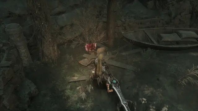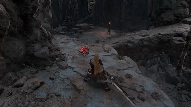 ・忘れられた者の墓 – 墓所エリア。階段を上った後振り返ると見える檻の中に鬼石がある。隣接する通路に混沌の手下(敵NPC)がいる。檻の外から投槍で破壊して入手。
