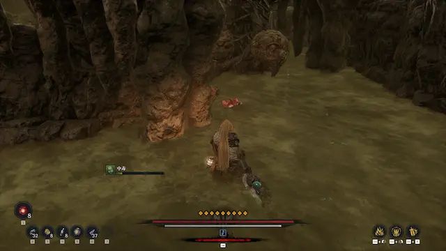 ・隠遁者の洞窟・野獣ルート – 野獣系の敵が多く出現する別ルートの洞窟エリア。地下捕食者と注視者(いずれも大型モンスター)が潜む崖上に鬼石。崖下からは見えづらいため、倒した後に崖上に登って確認する。