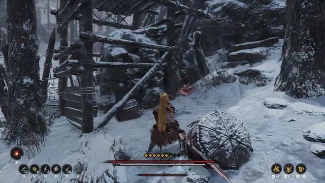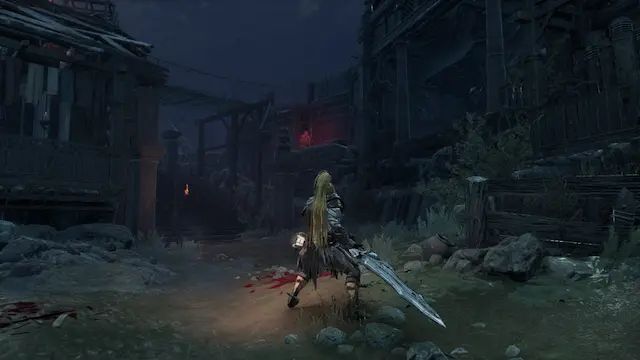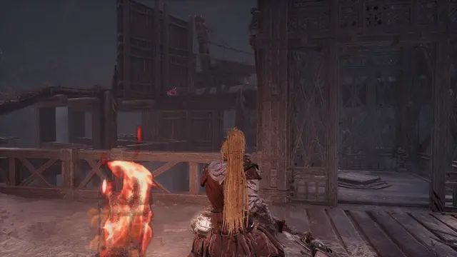 - 燃え盛る街 – 扉を破って奇襲してくる敵がいる建物の向かいにある梯子を登って振り向いた先に鬼石が落ちている 。投槍で破壊して入手。