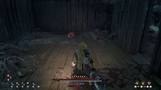・汚染された待合室 – 床が汚染された待合室エリア。曲がり階段の途中で上を見上げると柱の上に鬼石がある。その場で投槍を投げて破壊し、床に落としてから回収する。